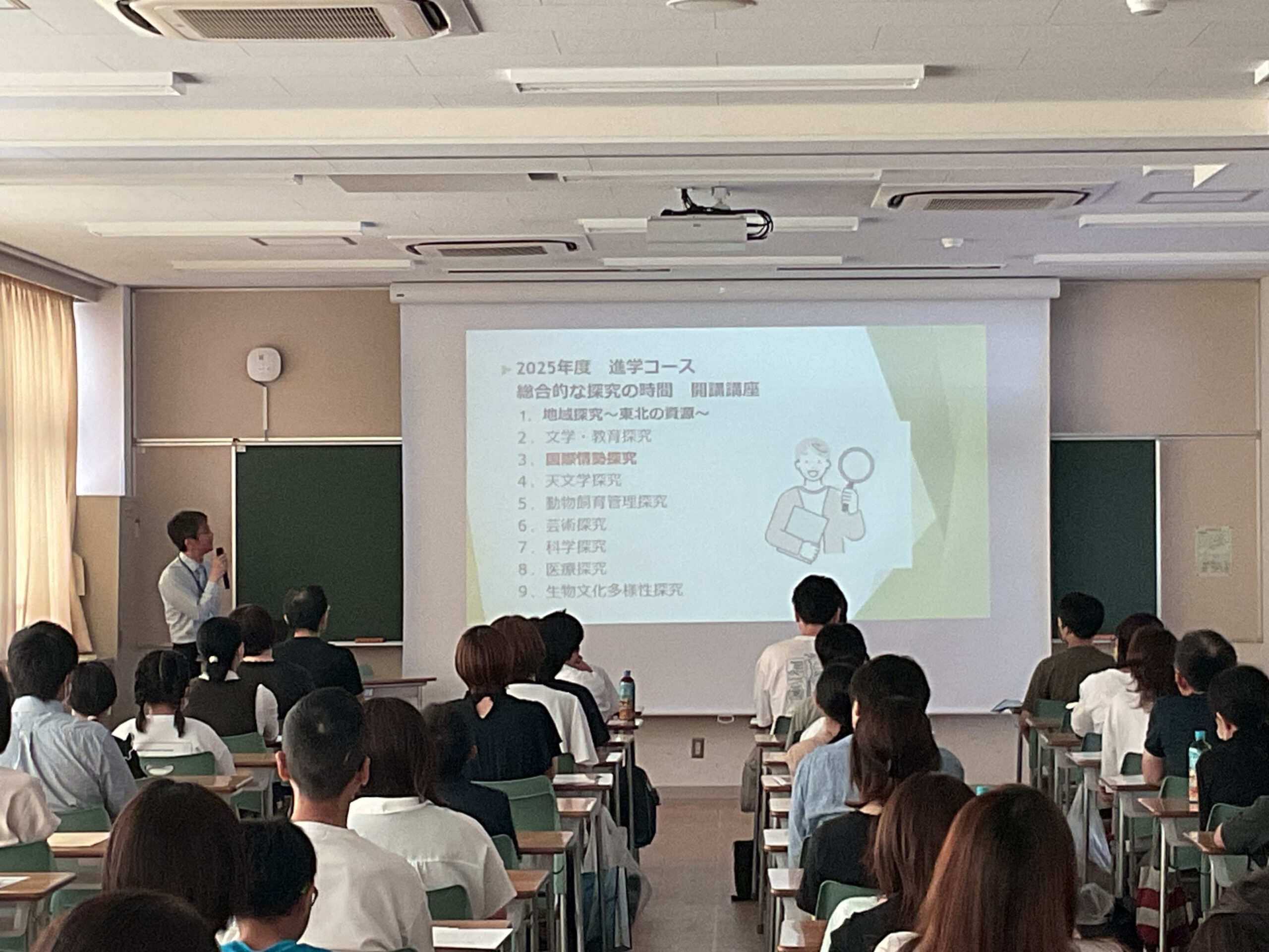 全体会では校長による挨拶に続き、生徒会および3年F組の生徒による学校紹介、副校長による新コース紹介、教頭によるコース理念の説明を行い、本校の学びの特色をお伝えしました。