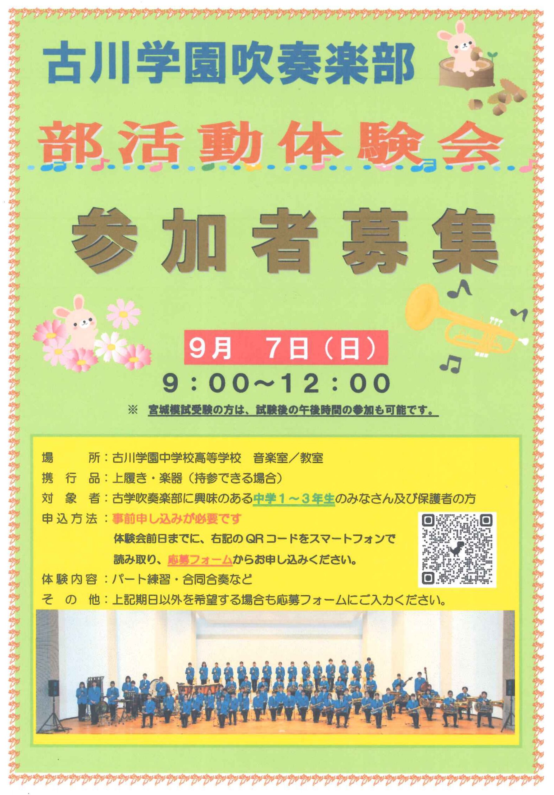 古川学園吹奏楽部では、9月7日(日)に「部活動体験会」を開催いたします。