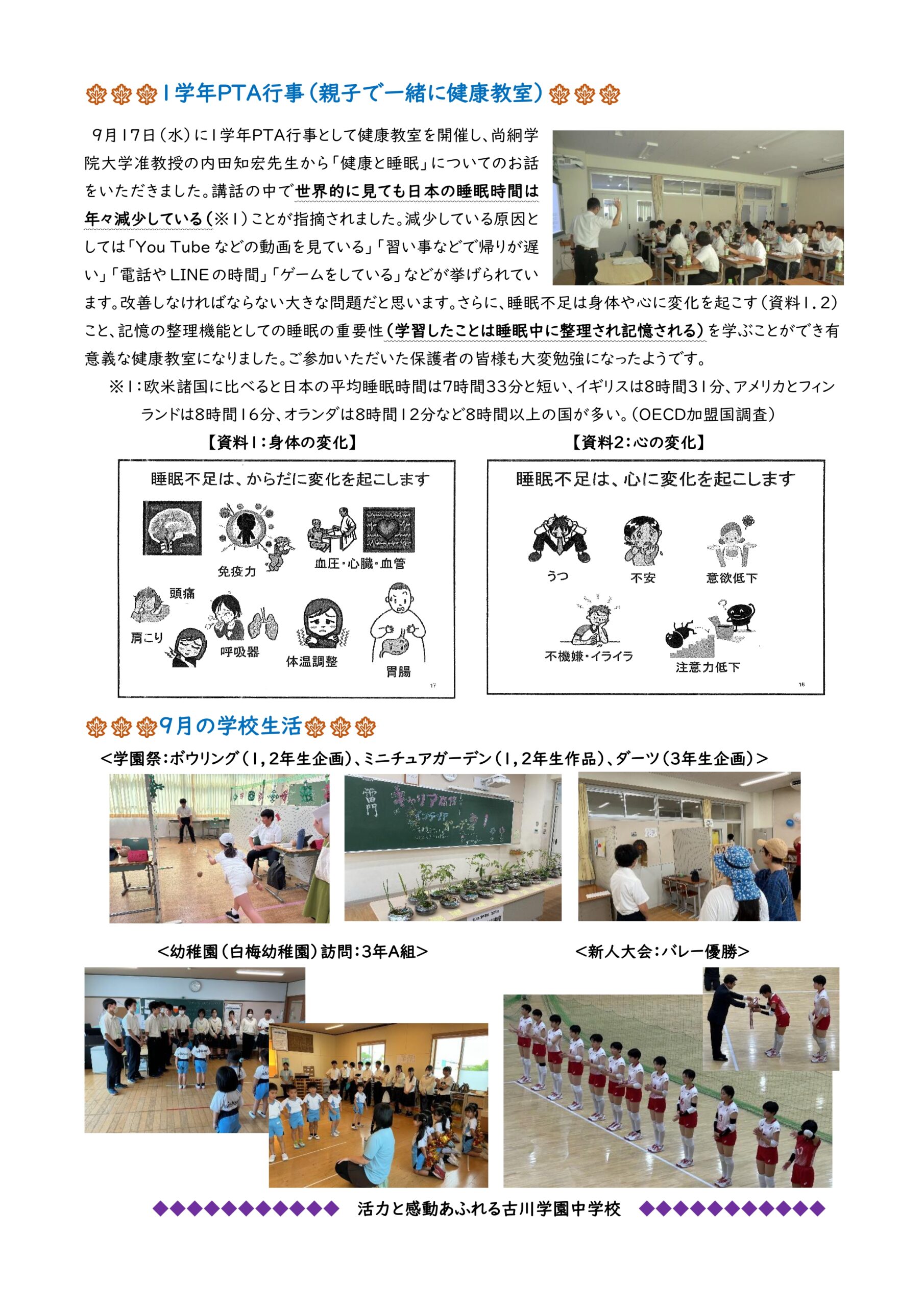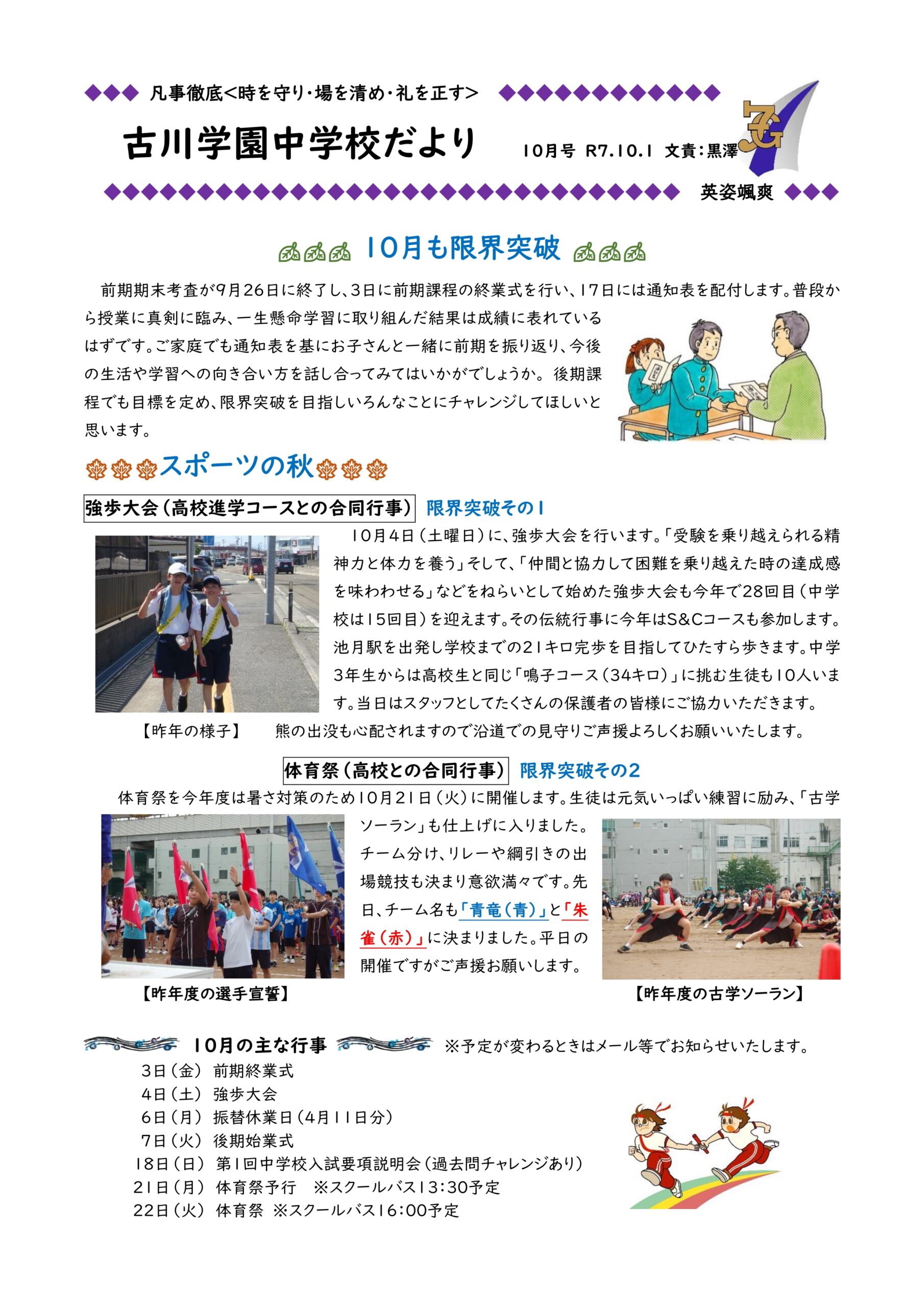 学校で配布しております「古川学園中学校だより」の10月号です。 当月の学校行事や、その時の生徒の様子が掲載されています。 ぜひご覧になってください。