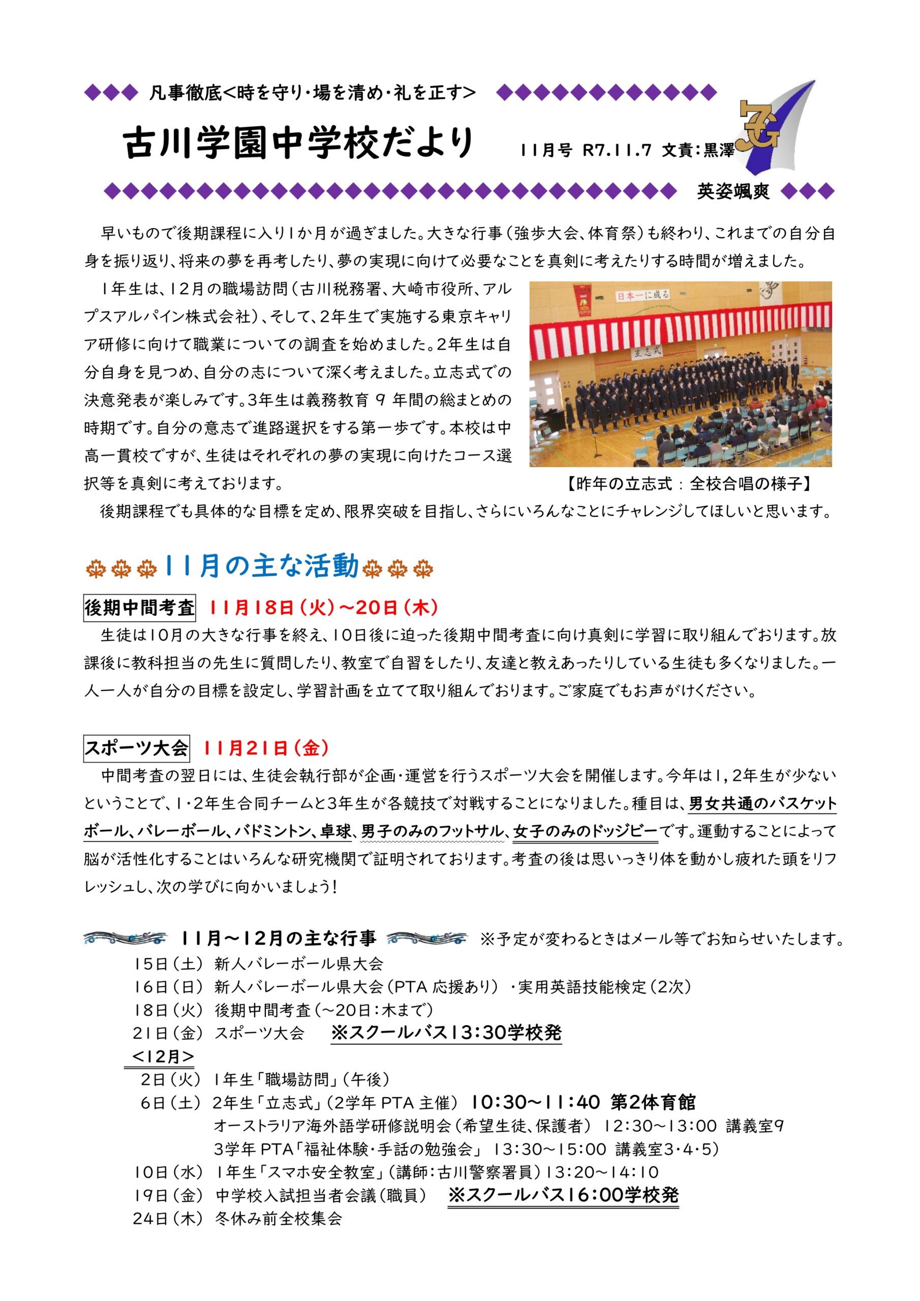 学校で配布しております「古川学園中学校だより」の11月号です。