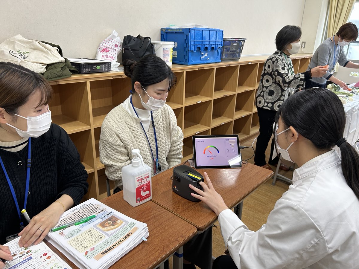 野菜摂取状況測定器「ベジメータ」を用いて各自の野菜摂取状況を測定し、日常生活の中で野菜を意識的に増やすことを考える機会となりました。