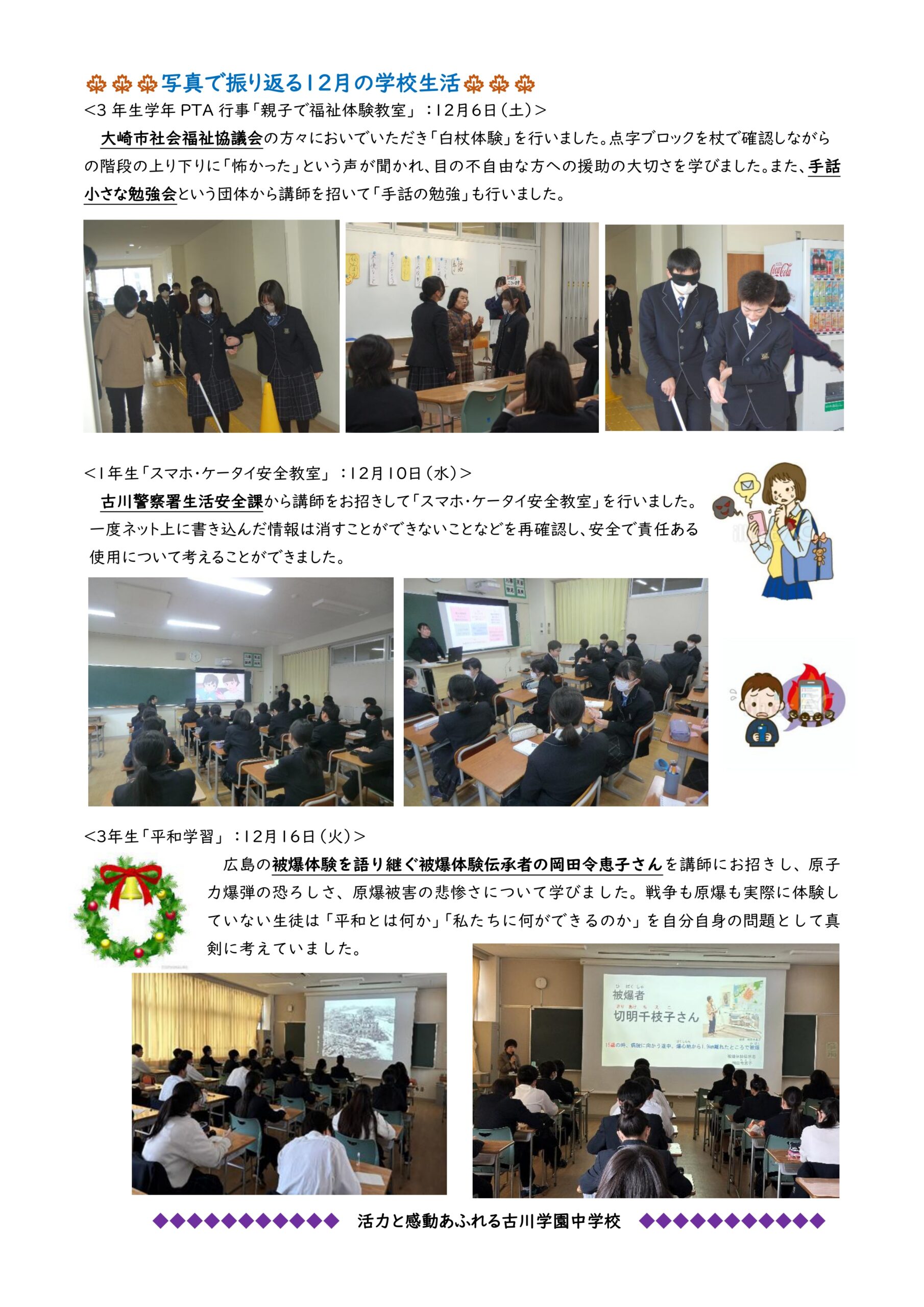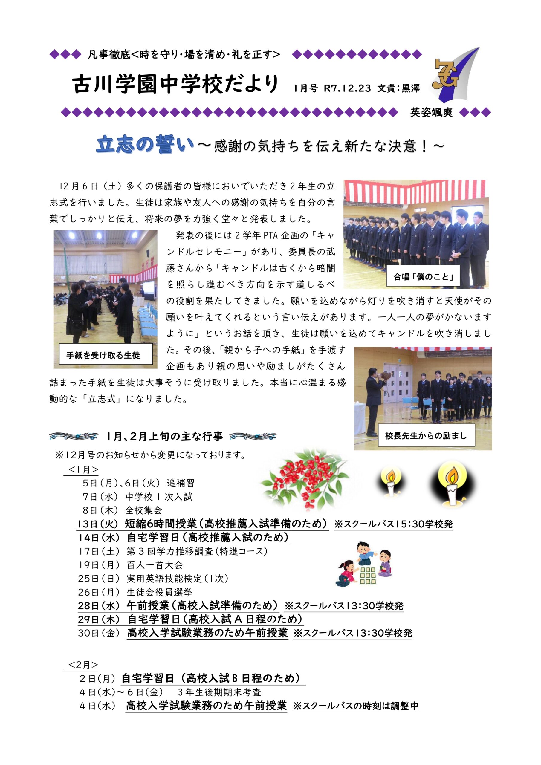 学校で配布しております「古川学園中学校だより」の1月号です。