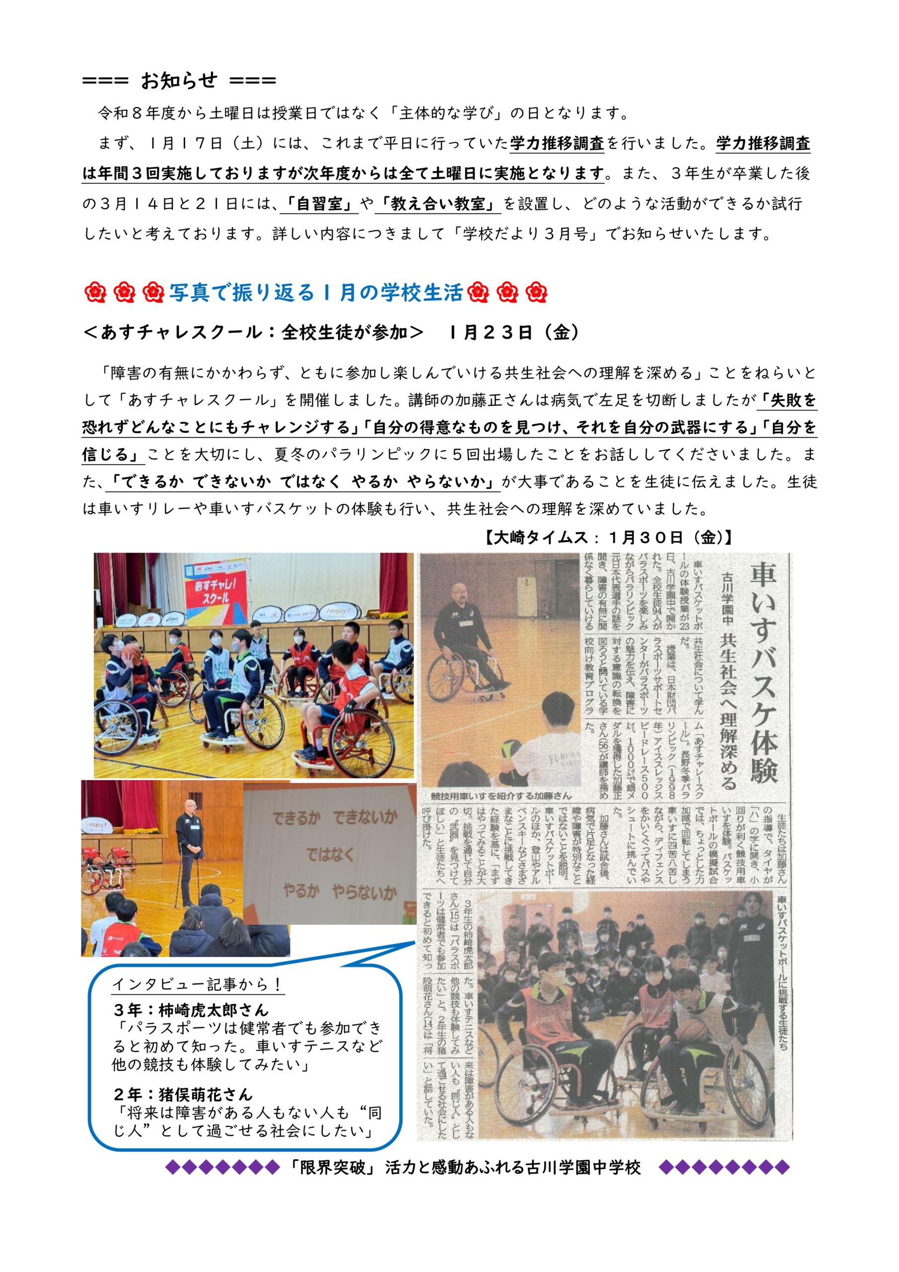 学校で配布しております「古川学園中学校だより」の2月号です。