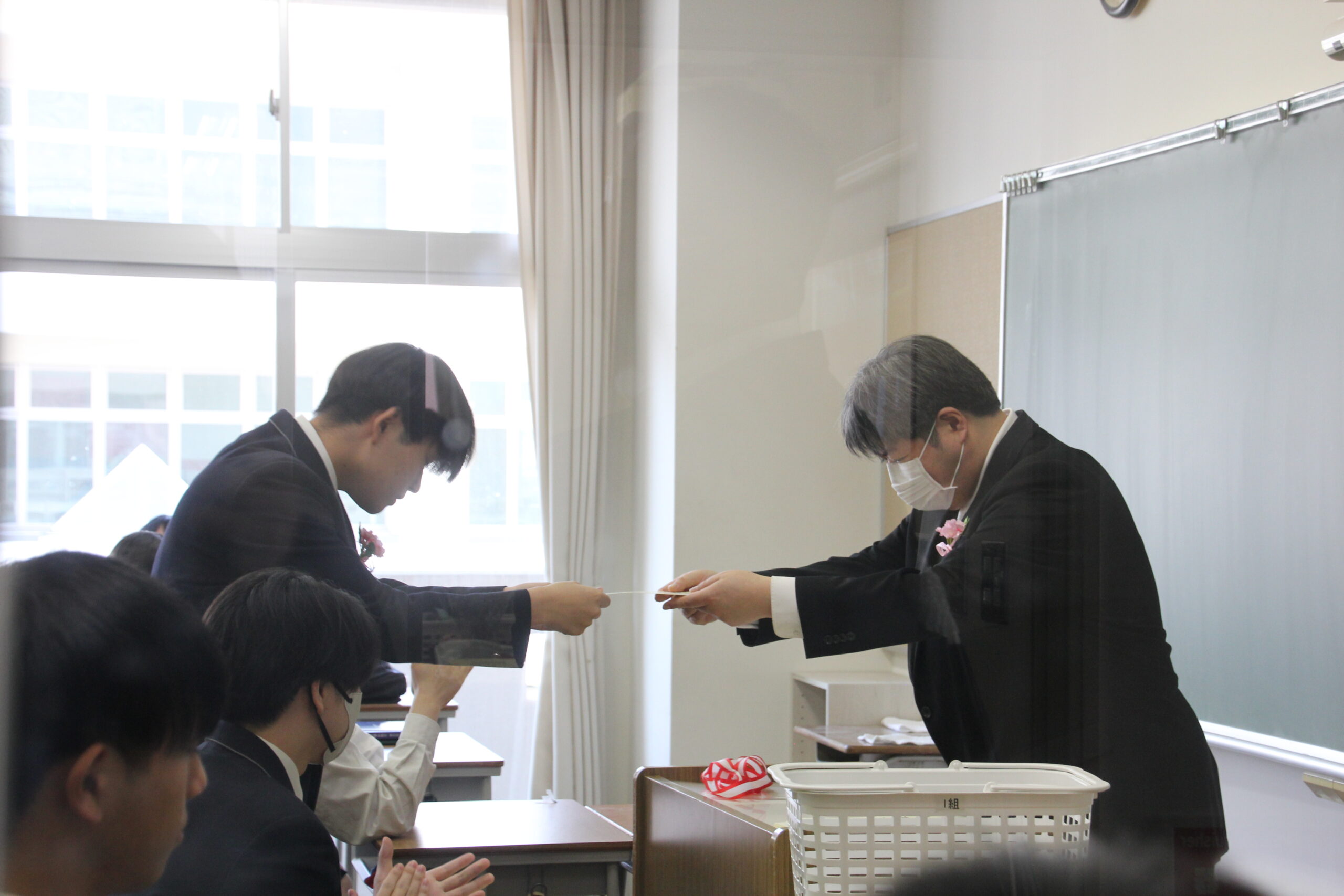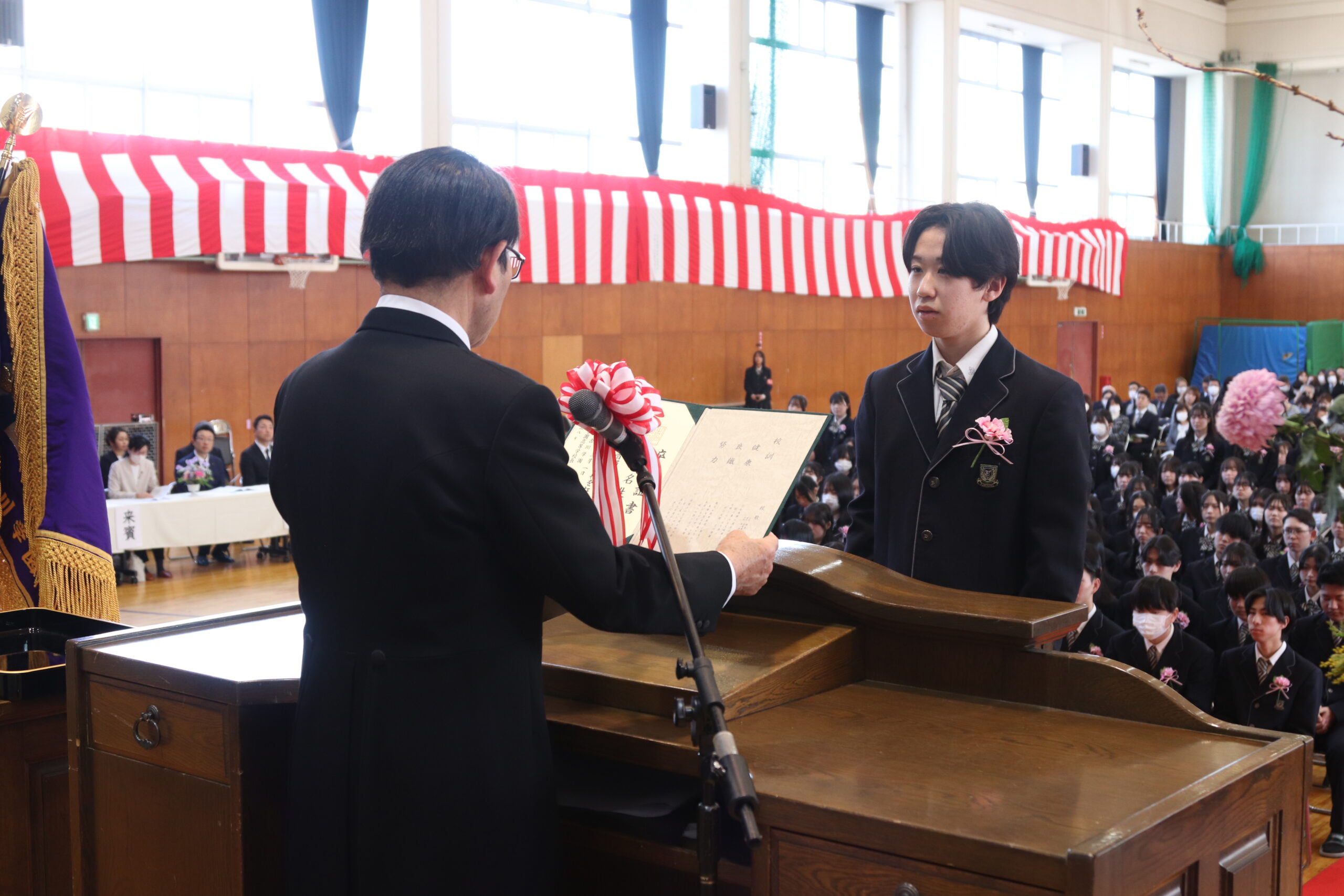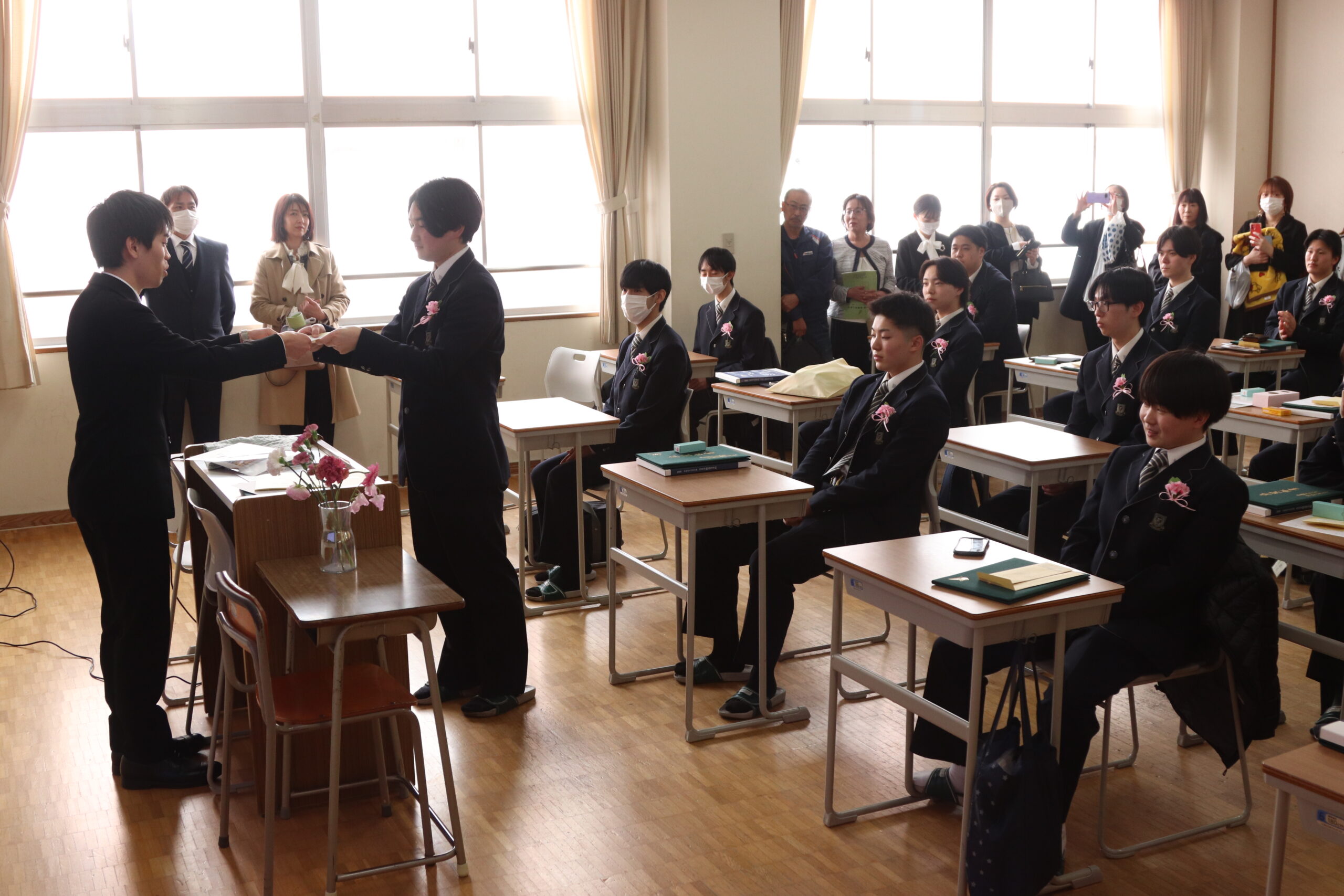 式では担任より一人ひとりの名前が呼名され、代表生徒に卒業証書が授与されました。