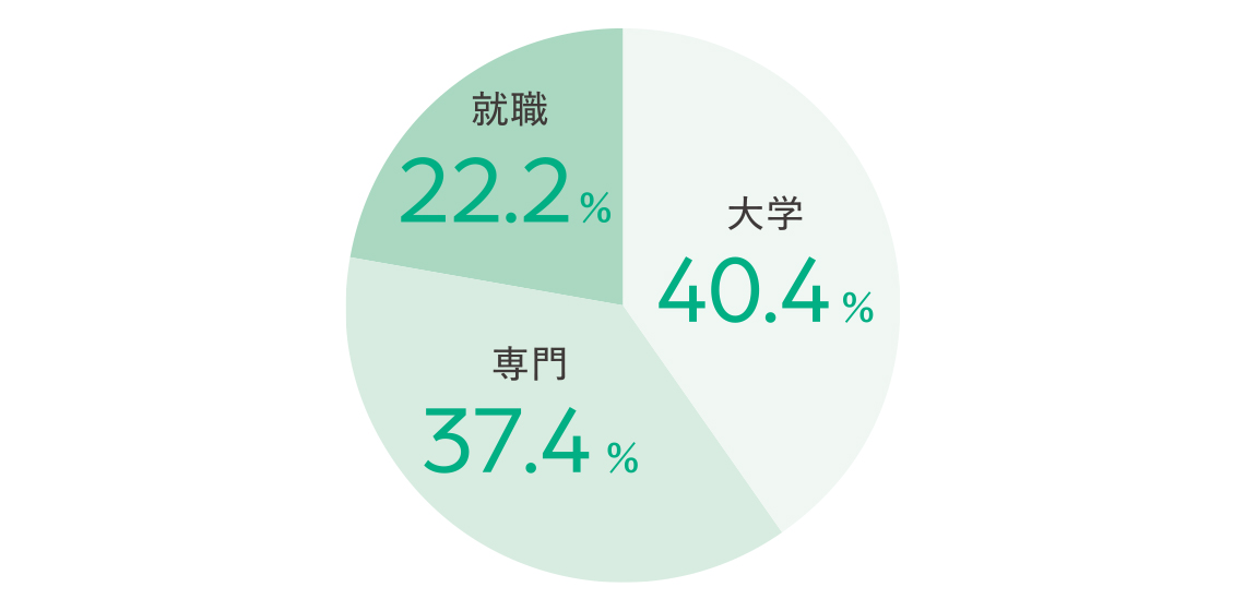 総合コースでは、高校生活3年間の中で自分自身にじっくり向き合いつつ、卒業後の進路を決定していきます。過去3年間では大学進学者が約40%、専門学校進学者が約37%、就職が約22%になっています。自分自身が設定した夢・目標の実現に向けて多種多様な進路選択が可能であり、万全のサポート体制を整備しています。