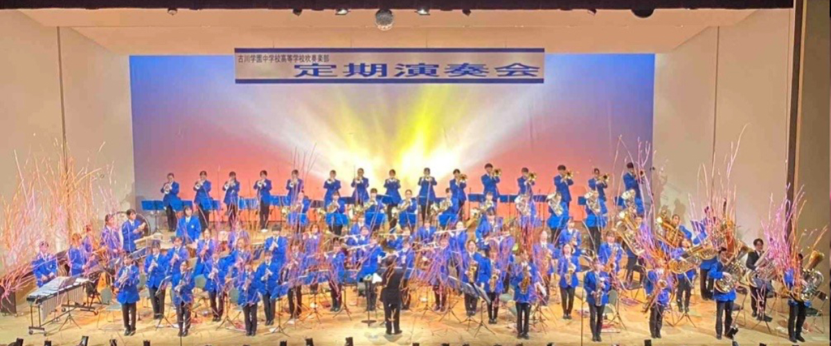 吹奏楽を通して、たくさんの仲間そして音楽を聴いてくださる皆さまとの出会いがあり、自分を成長させることの出来る部活動です。県内外より多数の依頼をいただいている招待演奏は常に好評を博しています。古学吹奏楽部の豊かな響きの根源は、一音一音に込められる部員たちの素直で謙虚な気持ちであり、それが感動の音楽を生んでいます。